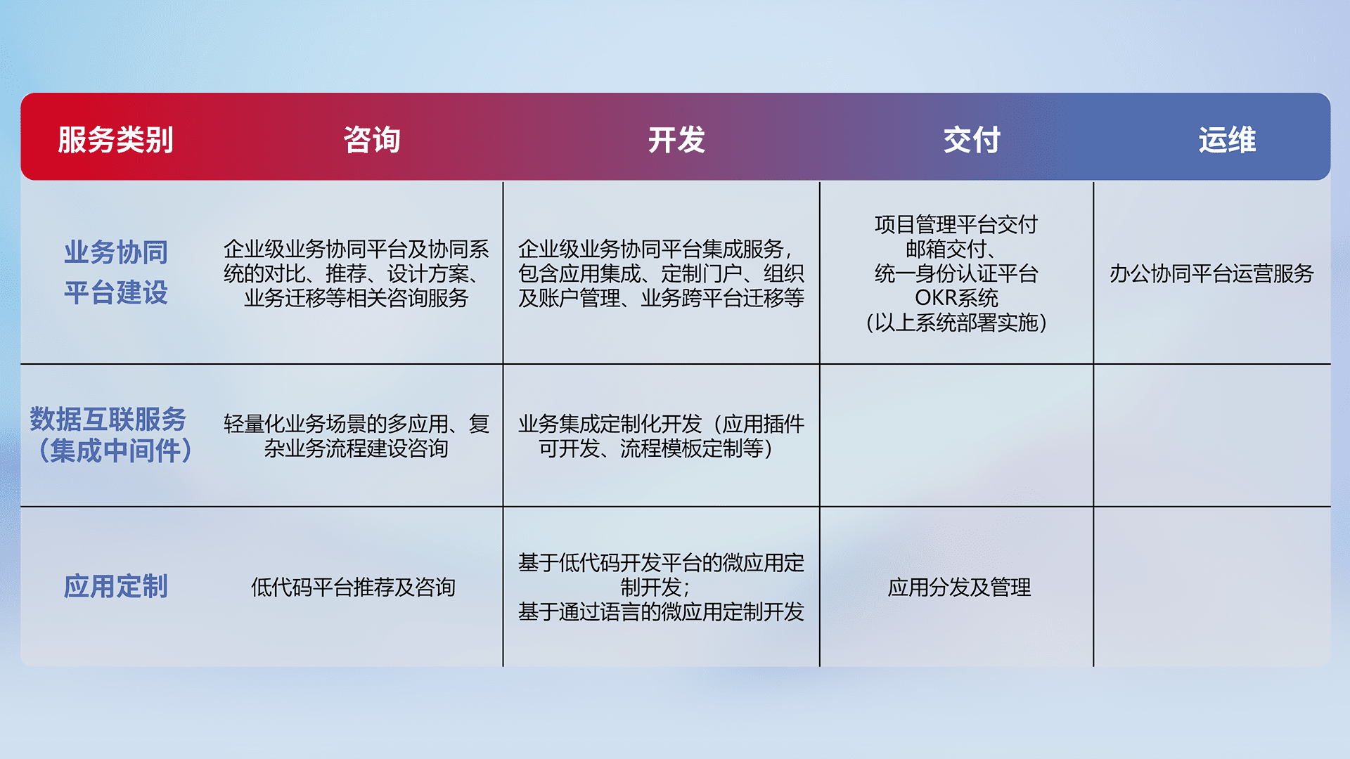 针对钉钉、、企微、、IDaas等平台级产品提供产品的规划、、方案、、、、交付、、、、定制化开发等服务,,,,实现如统一协同办公、、、智能客户服务、、、、混合会议管理、、智能数据查询、、等业务场景,,,实现数字化转型。。。