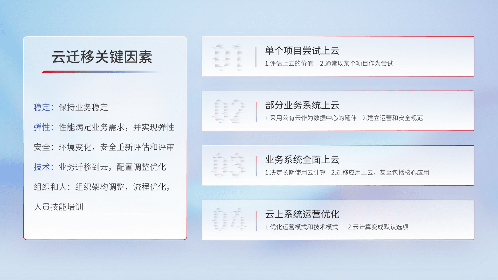 结合实际业务,,,从规划设计、、、、云平台选型、、云原生改造、、、数据迁移、、集成交付,,,迁移全过程为客户识别最佳上云路径,,做好风险识别管理,,,设计网络架构、、、身份权限、、、、安全审计合规、、、、操作审计、、、、日志审计、、、监控告警策略、、、、多站点容灾设计等,,,对云上基础设施进行整体规划,,,,提升IT治理水平,,,以满足弹性、、、高可用、、、高性能的需求。。