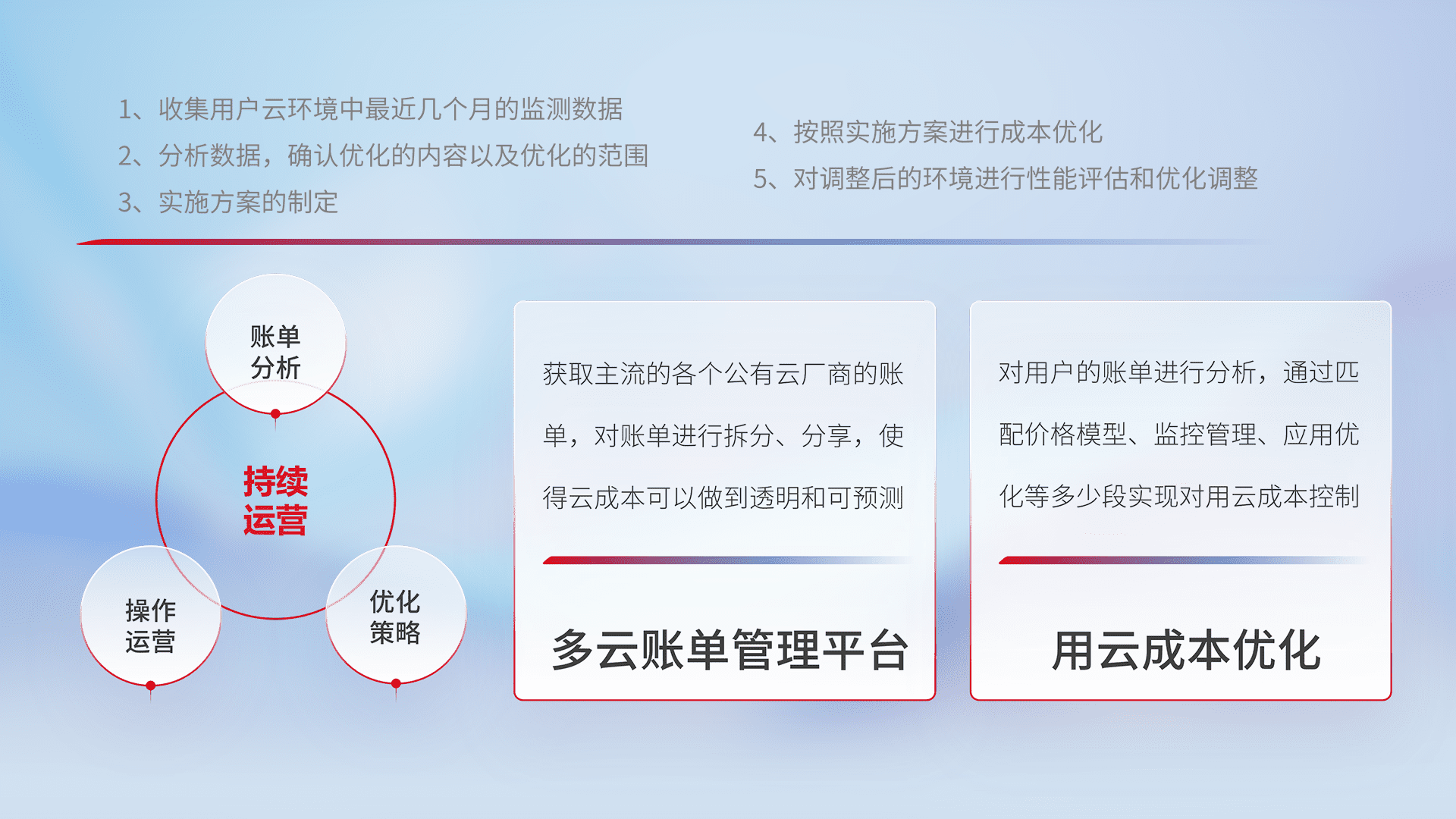 通过灵活运用多种自动化迁移工具,,,,帮助企业用户实现业务和数据高效 、、、稳定的上云迁移和云上迁移,,,,采用自研多云纳管平台,,以中立管理模式,,解决多组织、、、多云、、、、多运维厂商的复杂关系的管理,,保证多云平台资源配置的一致性,,,,实时掌控云资源运行数据,,,,运用智能化工具分析云资源多云平台的管理服务,,,透明化管理成本支出,,用云成本可预测、、用云费用可优化、、云资源配额有据可依。。